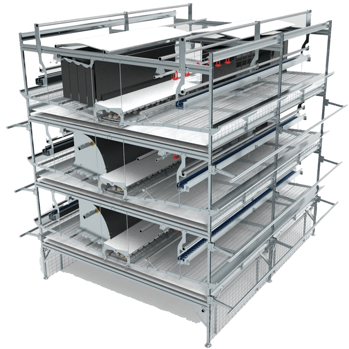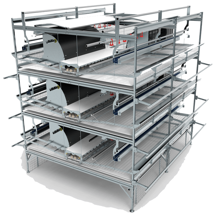 • Tutti i piani sono equipaggiati con nidi per la deposizione, mangiatoie e abbeverazione
